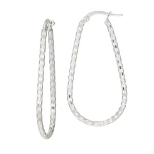 14K White Gold Stripe Texture Elongated Round Teardrop Hoops