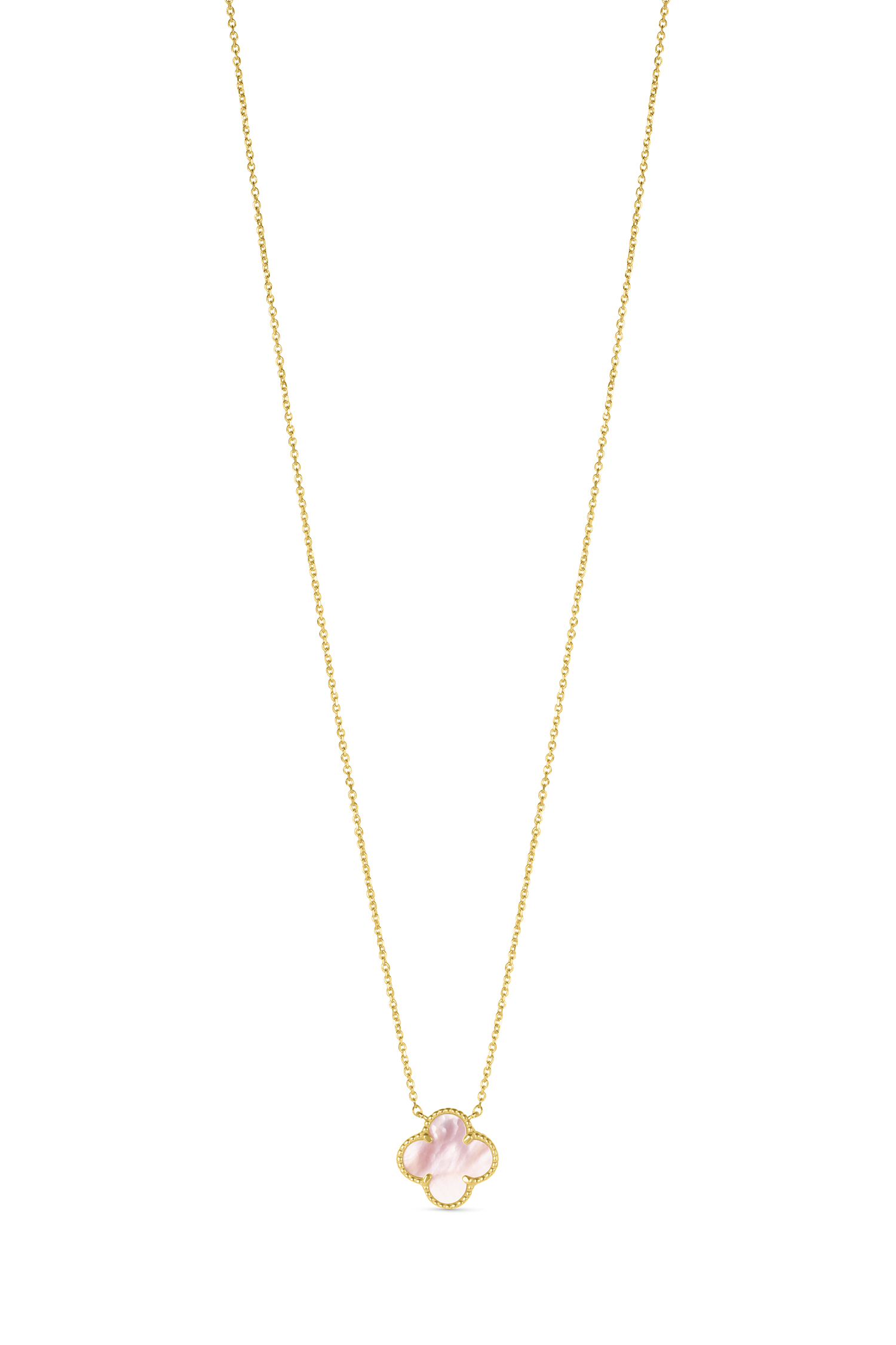 14K Yellow Gold Italian Pink Mother of Pearl Clover Necklace with 16"-18" extender